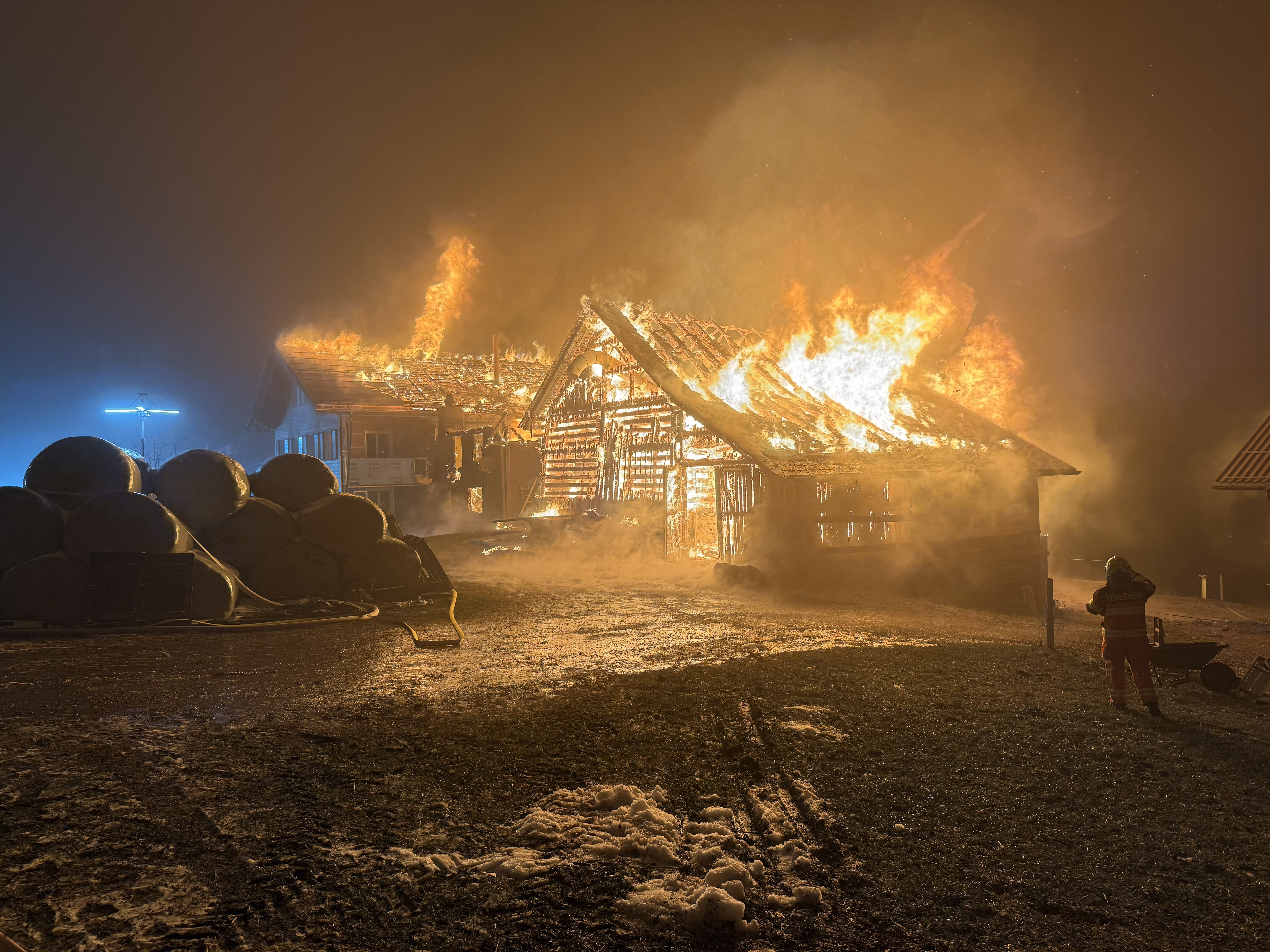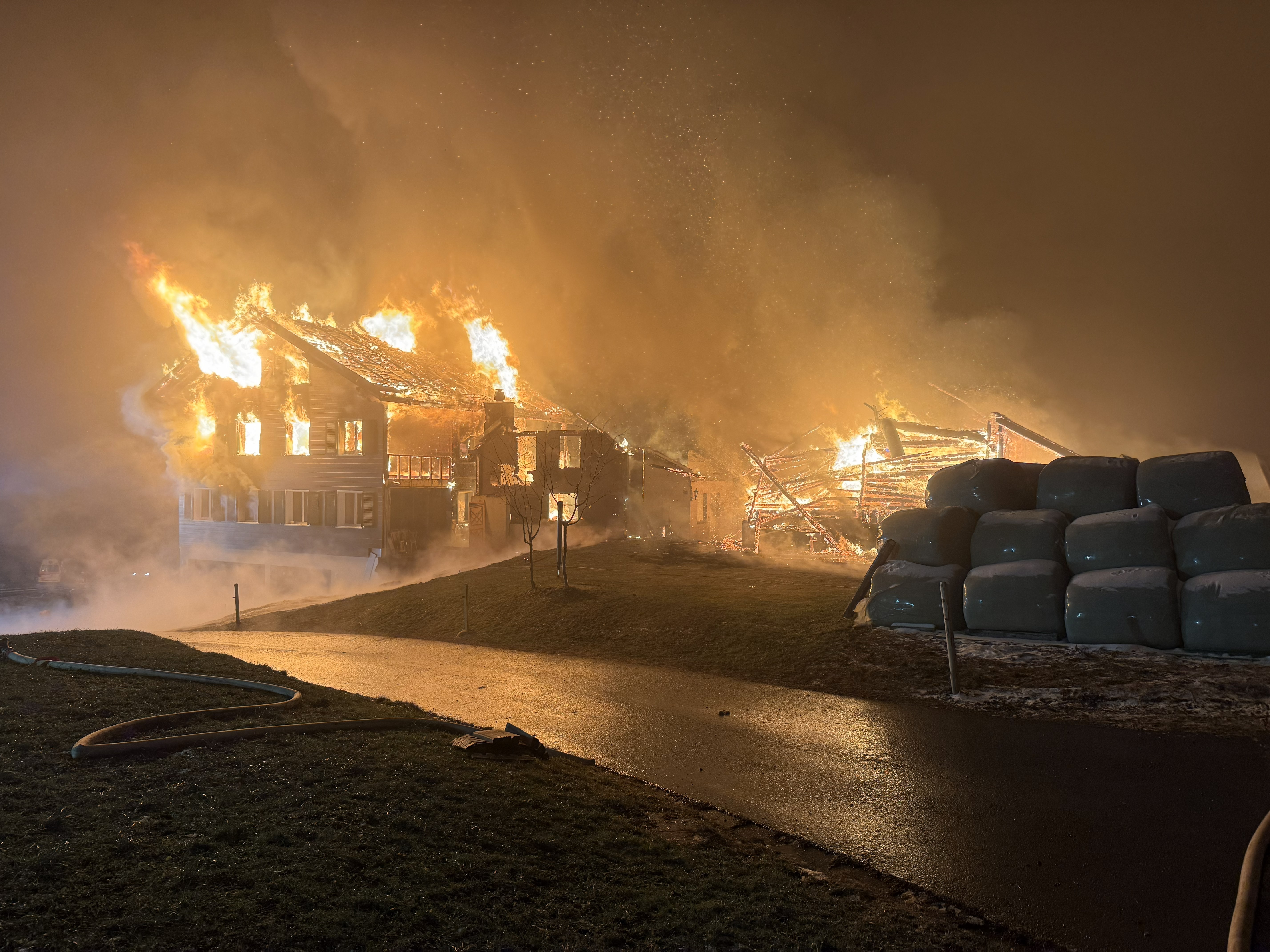 Trotz des raschen Ausrückens der Einsatzkräfte griffen die Flammen auf das neue Wohnhaus sowie den angrenzenden Stall über. Alle drei Gebäude brannten vollständig nieder. Ein weiterer, sich ebenfalls auf der Liegenschaft befindlicher Stall konnte durch die Feuerwehr gehalten und gesichert werden.
