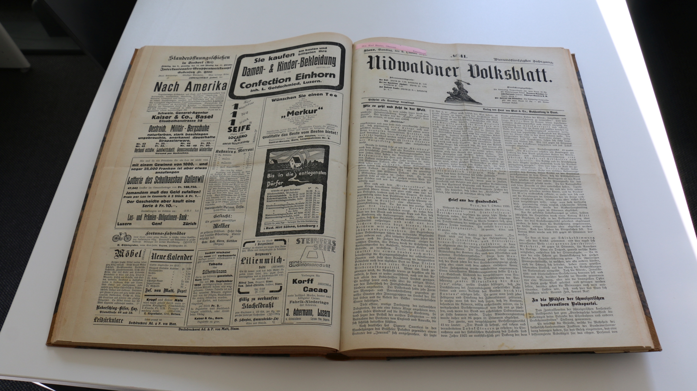 Um die Zugänglichkeit zu erleichtern und unabhängig von Standort und Öffnungszeiten zu ermöglichen, entschied sich die Kantonsbibliothek vor geraumer Zeit, die Ausgaben des «Nidwaldner Volksblatt» von 1866 bis 1985 zu digitalisieren und online zur Verfügung zu stellen. Dafür wurde der gesamte Bestand temporär in ein Scan-Fachlabor verschoben. Dort wurde für jede Ausgabe ein digitales Exemplar produziert. 150 Kilogramm Papier respektive 56’955 Zeitungsseiten erzeugten eine Datenmenge von 3000 Gigabyte. Damit in den Digitalisaten nach Stichworten gesucht werden kann, mussten diese mit einer optischen Texterkennung ausgestattet werden. Der Eigenheit von Zeitungen, verschiedene Artikel pro Seite zu platzieren, wurde mit einer Segmentierung Rechnung getragen. Die Texterkennung wird zwar automatisch generiert, Verunreinigungen oder untypisches Layout führen aber zu Fehlern, die von Hand korrigiert werden müssen. Entdeckte Fehler können von Benutzern behoben werden. Wer Freude an einer solchen Arbeit hat, kann sich auf der Webseite als Korrektorin bzw. Korrektor registrieren lassen.