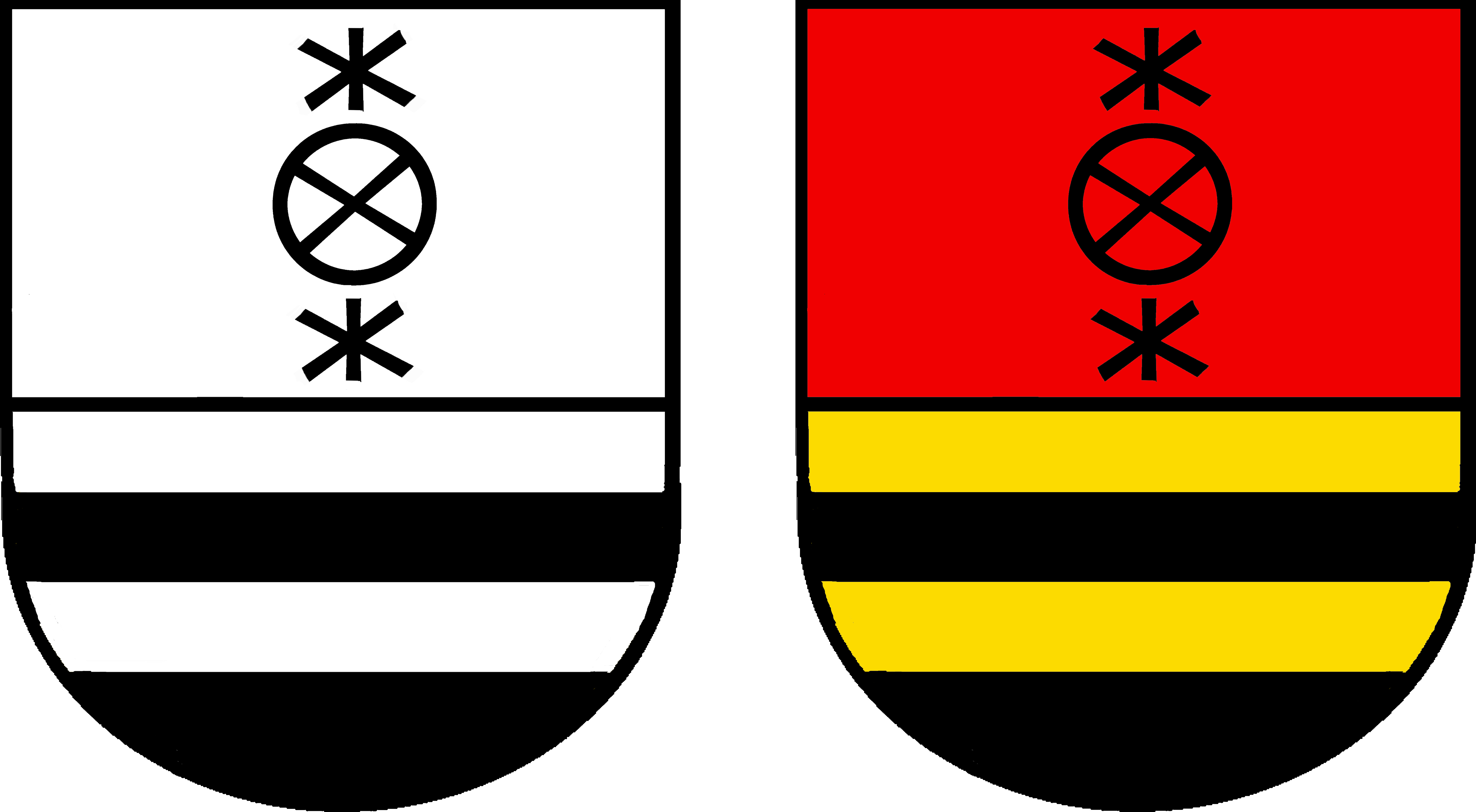Geteilt von Rot mit schwarzem Hauszeichen aus schrägem Radkreuz zwischen zwei Kuppelkreuzen, pfahlweise angeordnet, und dreimal von Gold und Schwarz.