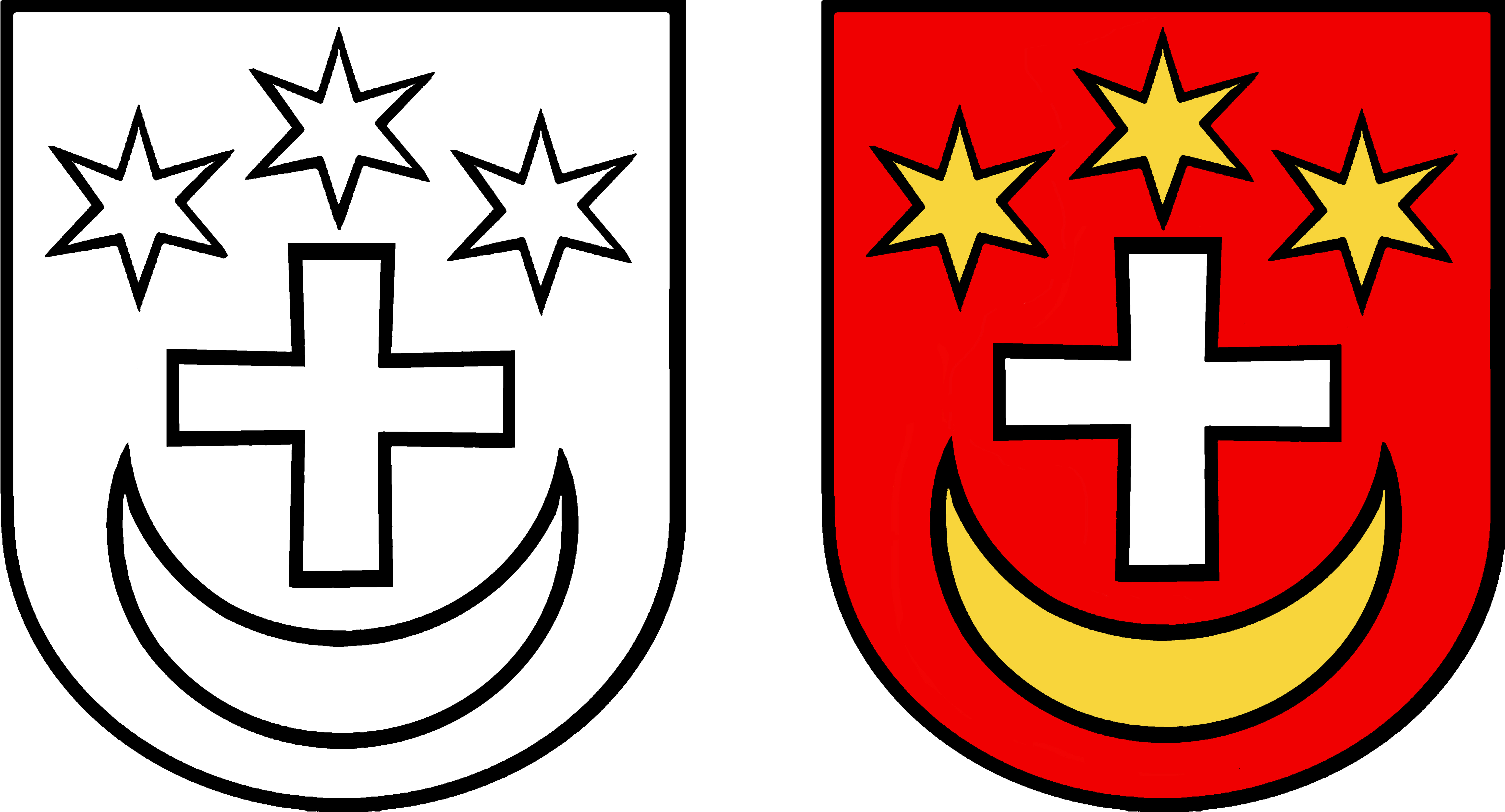 In Rot ein silbernes Kreuz über einem wachsenden goldenen Mond, überhöht von drei sechsstrahligen goldenen Sternen.