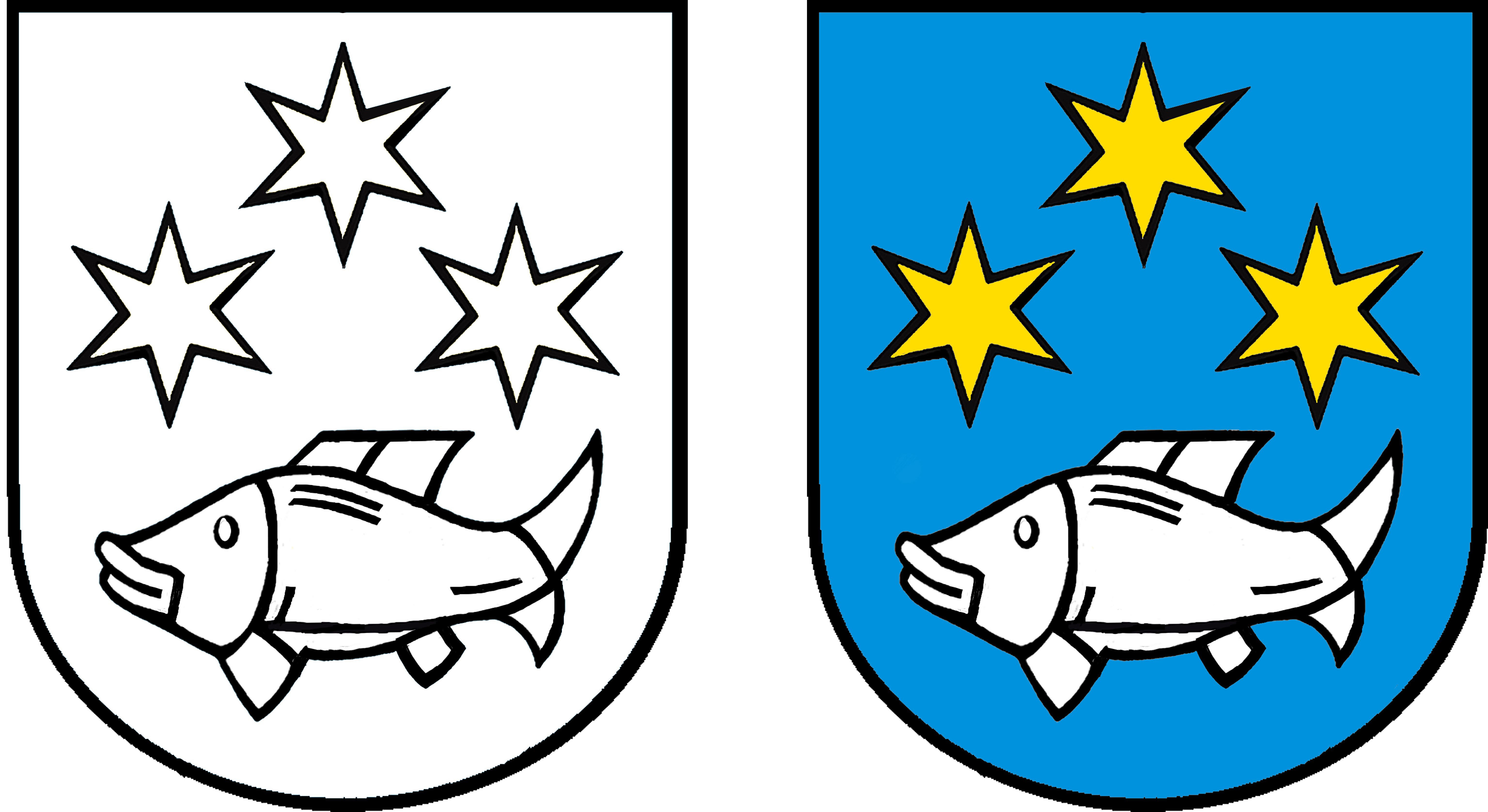 In Blau ein silberner Fisch, überhöht von drei sechsstrahligen goldenen Sternen 1:2.