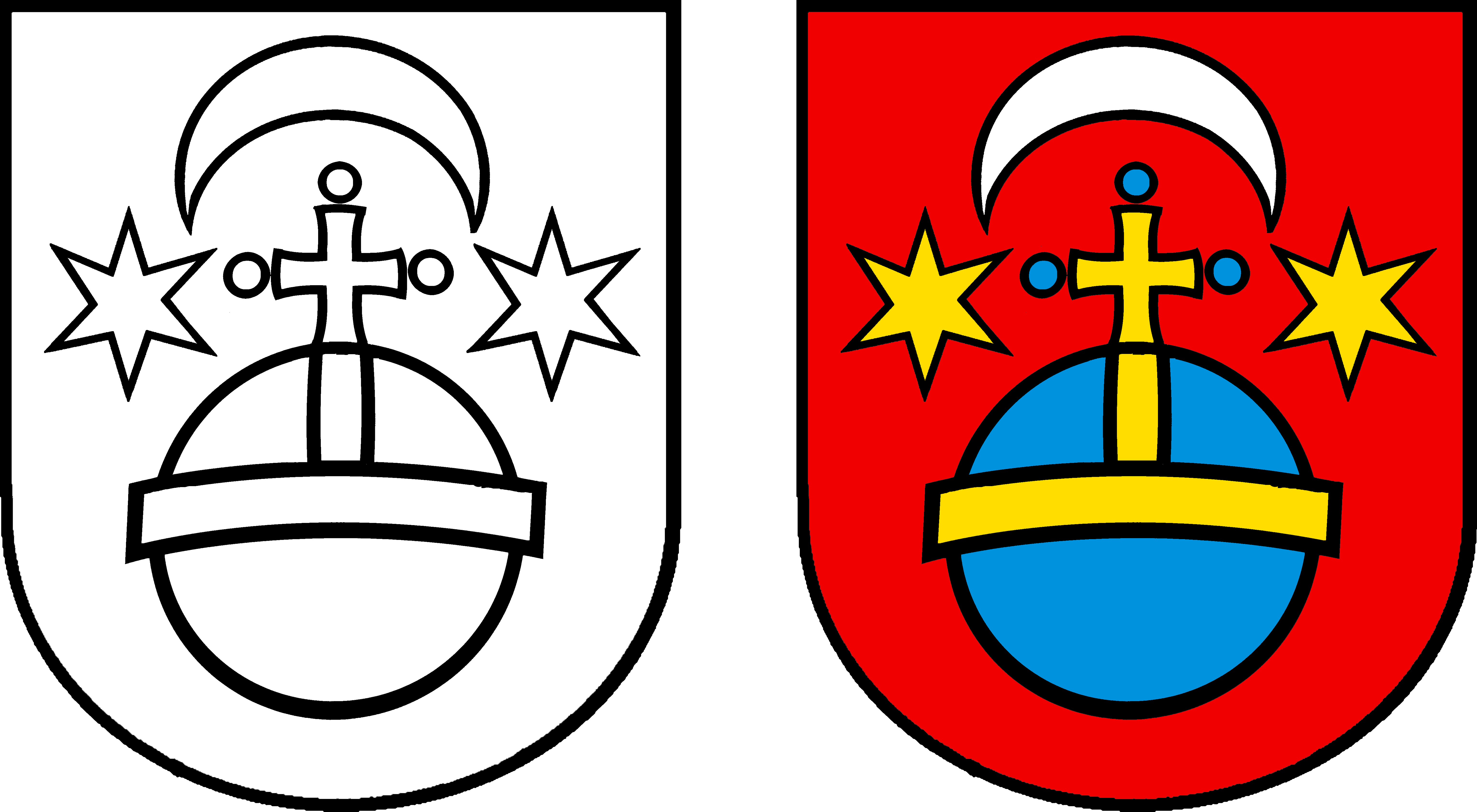 In Rot ein blauer Reichsapfel mit goldenen Spangen und goldenem Kreuz, beseitet von zwei sechsstrahligen goldenen Sternen, überhöht von einem gestürzten silbernen Mond.