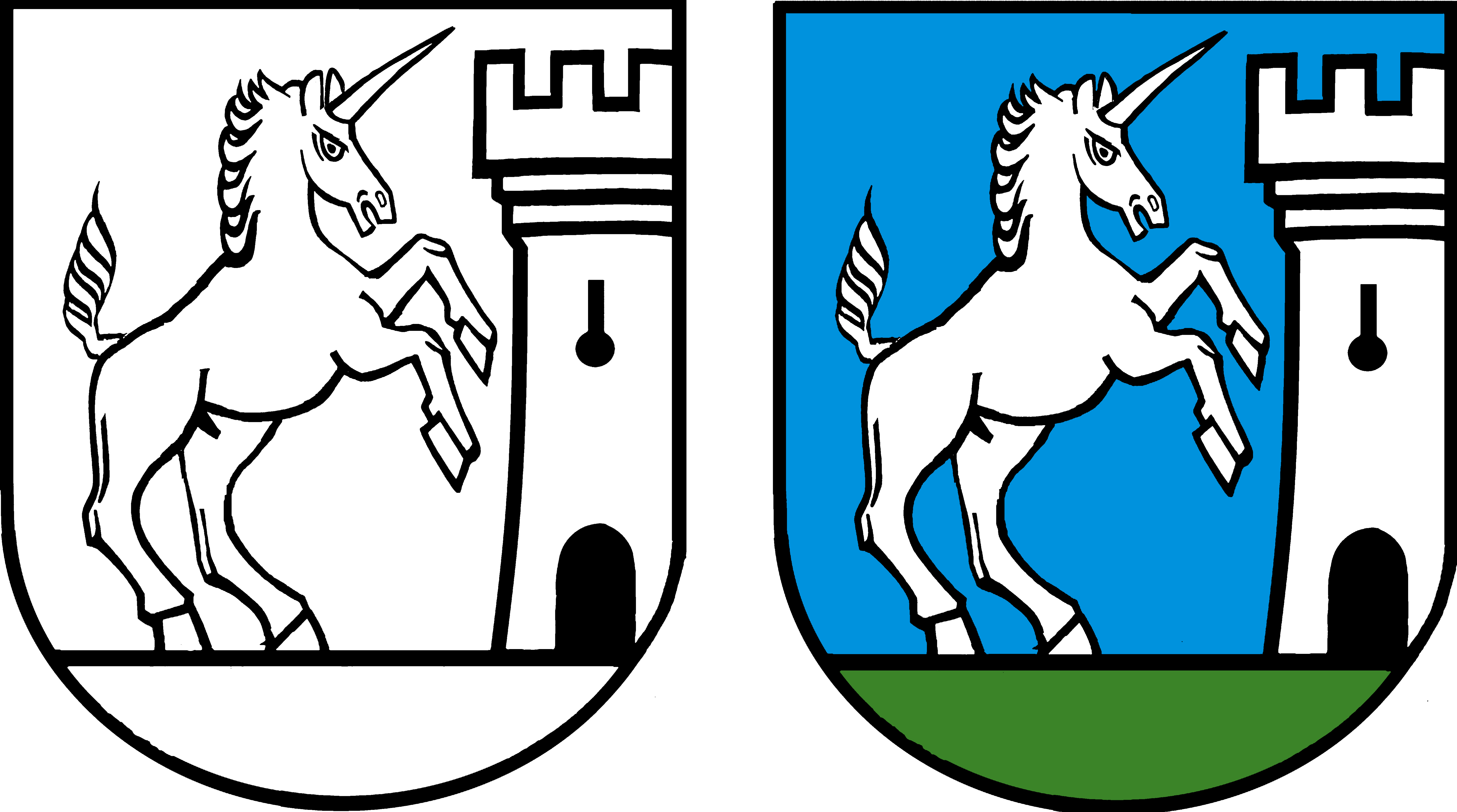 In Blau auf grünem Schildfuss ein linksgekehrtes, springendes silbernes Einhorn, links begleitet von einem bezinnten silbernen Turm.