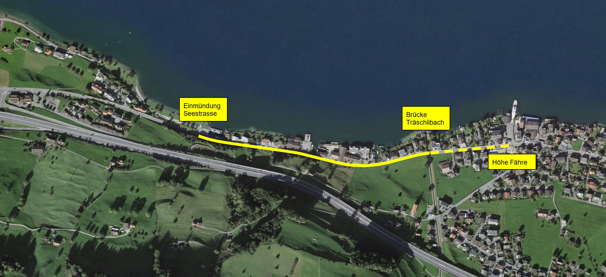 Ziel des Projekts ist es, das Unfallpotenzial zu minimieren und die Verkehrssicherheit für alle Verkehrsteilnehmer zu erhöhen. Ausserdem soll auf der rund 1 Kilometer langen Strecke ein beidseitiger Veloweg erstellt werden. Das Teilstück gehört zum kantonalen Radwegkonzept und zu mehreren nationalen Radrouten. Im Wesentlichen sieht das Projekt vor - ausserorts, von der Einmündung Knoten Seestrasse bis zur Träschlibachbrücke - die bestehende Linienführung zu belassen und die Fahrbahn von heute 6 auf 9.5m bergseitig zu verbreitern.